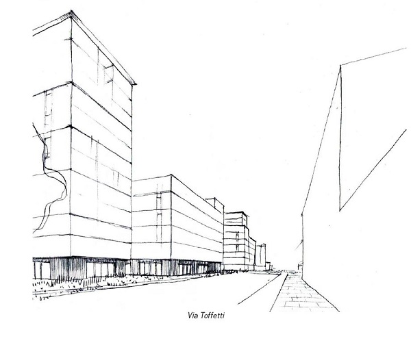 - edifici che riprendendo, in parte, gli allineamenti e le direttrici degli isolati preesistenti, si configurano come corti aperte verso il Parco pubblico e, allo stesso tempo, creano una nuova cortina urbana lungo la via Toffetti;