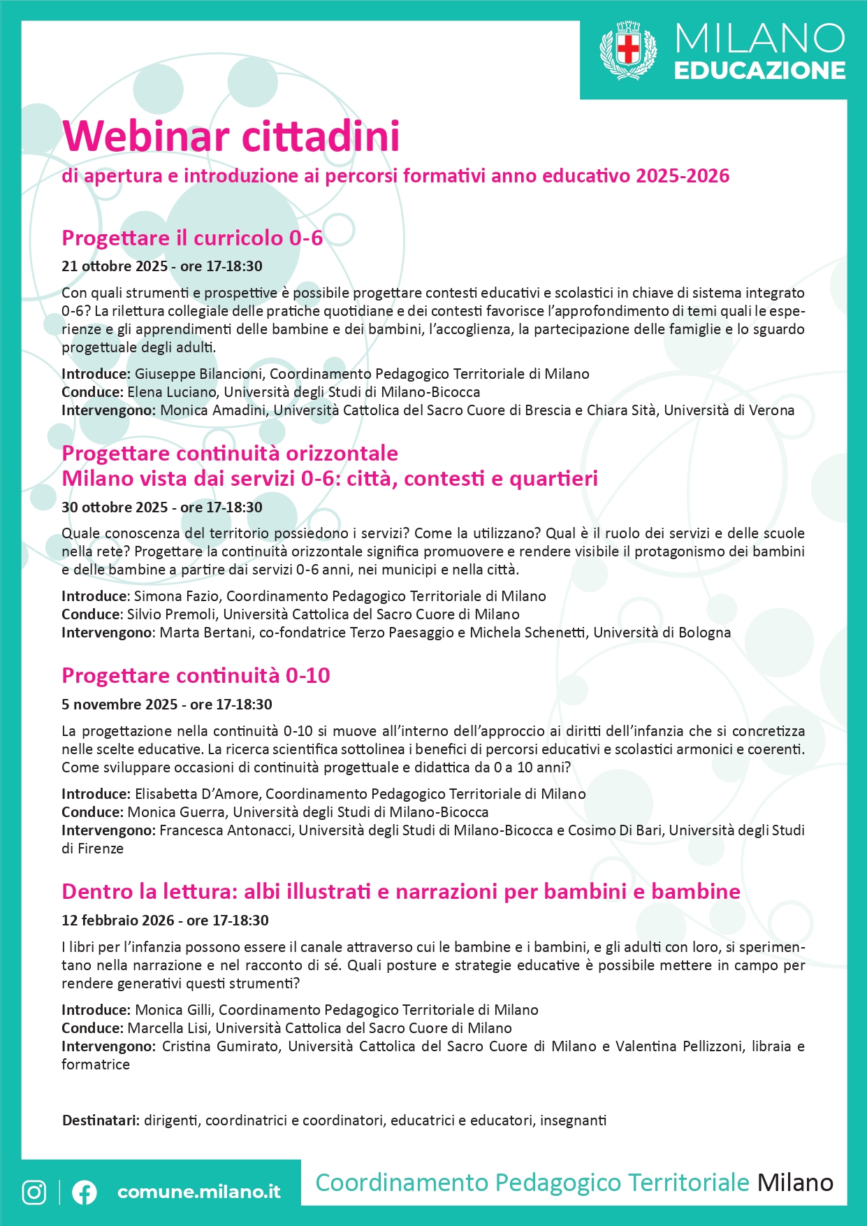 La proposta formativa 2025/2026 del Coordinamento Pedagogico Territoriale della città di Milano è dedicato a coordinatori e coordinatrici, personale educativo e personale docente e vede il coinvolgimento delle famiglie.