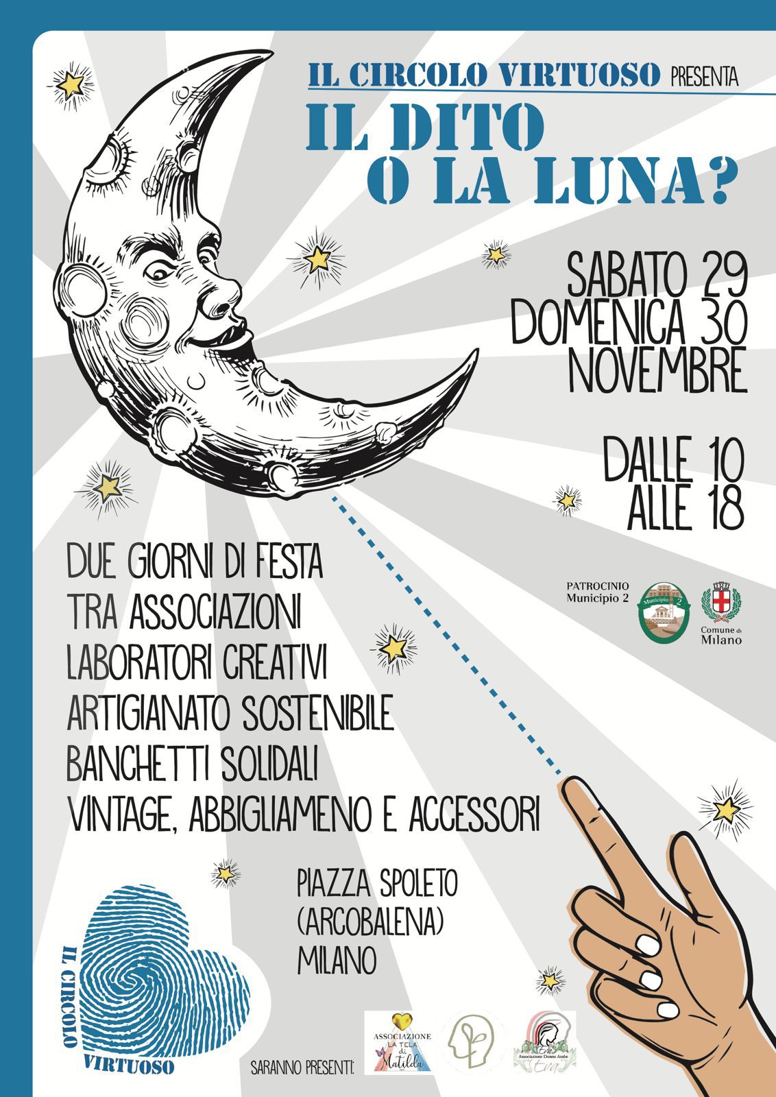 L’Associazione Il Circolo Virtuoso APS, nel proseguire la sperimentazione avviata in occasione della Green Week 2024, organizza l'iniziativa “Il dito o la luna - le realtà associative del Municipio 2 – servizi raccolta fondi e artigianato”, che si svolgerà