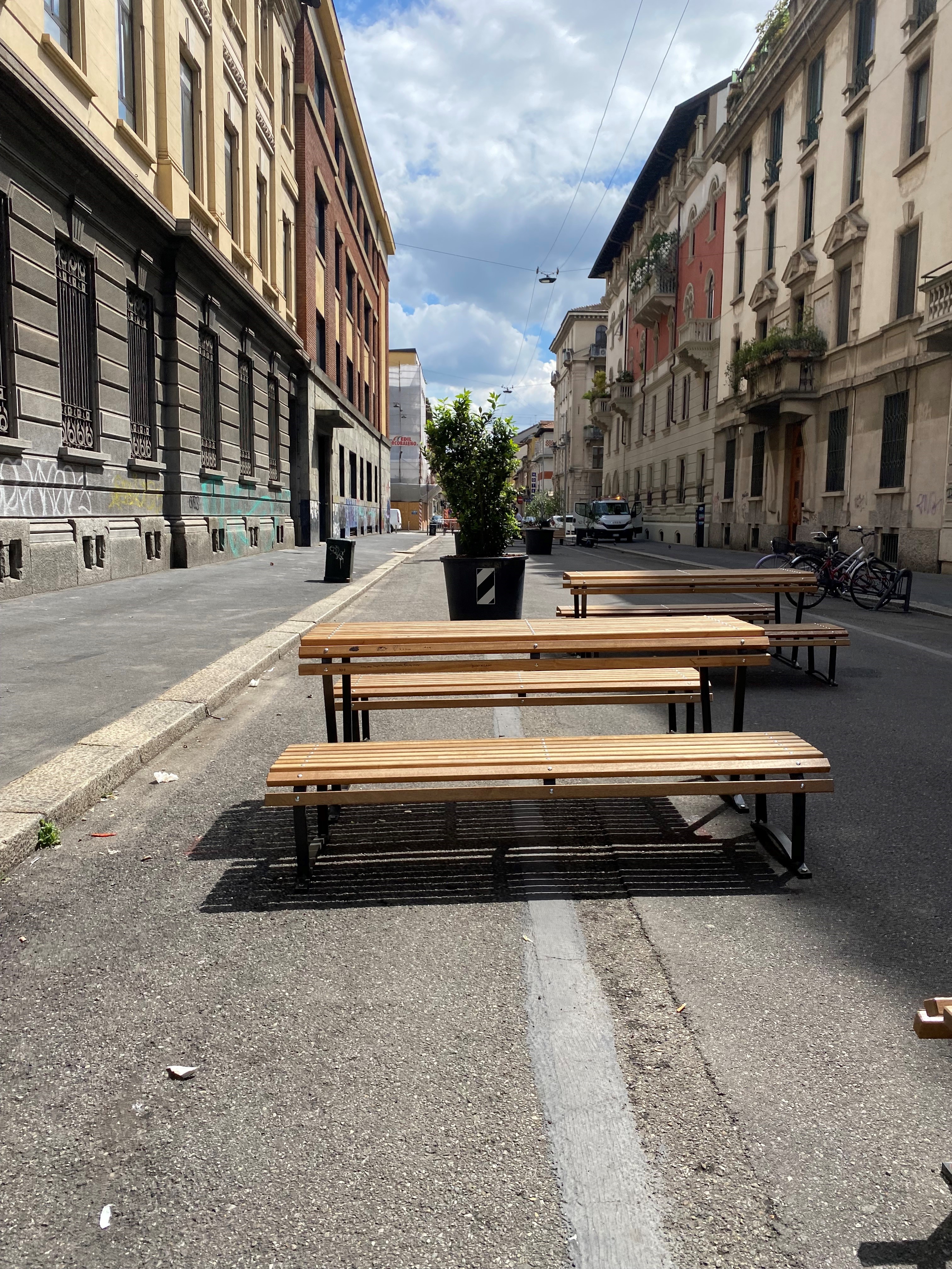 L’intervento sulla nuova Piazza Sacchini prevede, oltre alla pedonalizzazione della via e alla posa di arredi come panchine, tavoli da pic nic e tavoli da ping pong, la colorazione della strada in chaive di urbanistica tattica, in programma per il mese di settembre, con la colorazione degli spazi da parte dei volontari e delle volontarie, degli alunni e delle alunne.